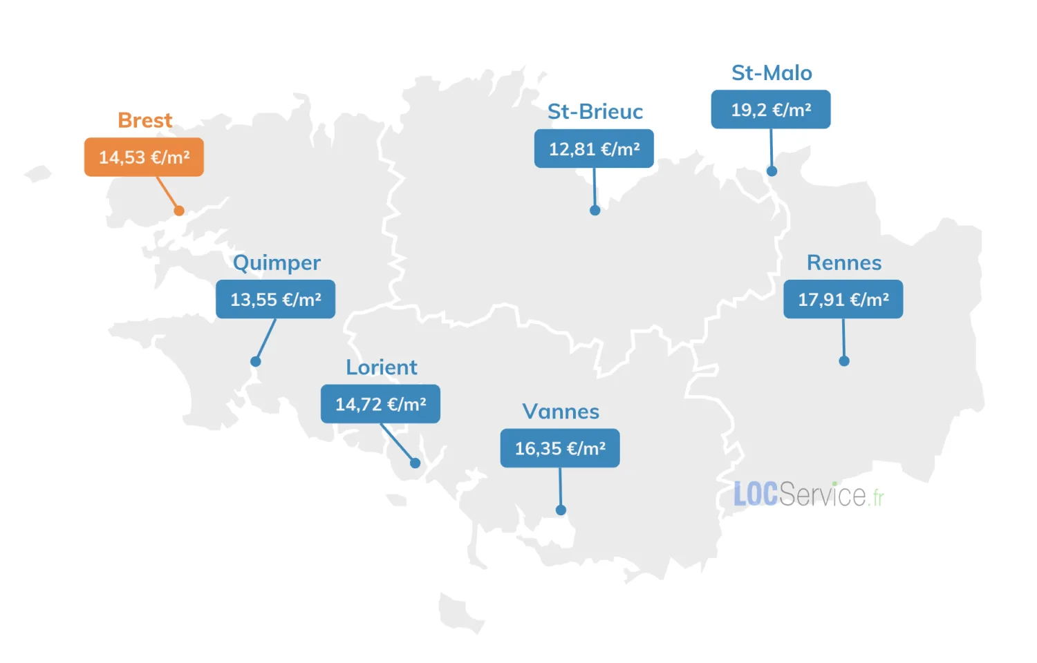 Brest compte près de 56 % de locataires (chiffre INSEE). Selon l’étude LocService.fr, le loyer moyen charges comprises pour se loger à Brest s’établit à 534 € pour 36,7 m² soit 14,53 €/m².