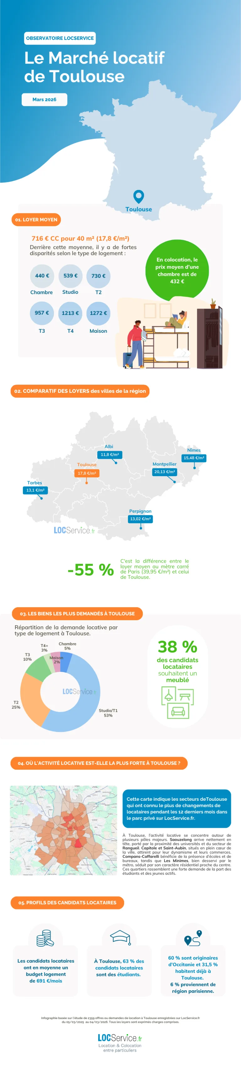 Toulouse compte près de 66 % de locataires (INSEE). Selon l’étude LocService.fr, le loyer moyen charges comprises s’établit à 716 € pour 40 m² , soit 17,8 €/m². Ce niveau marque une légère hausse de 2,2 % sur un an, contre 17,42 €/m² en 2025.