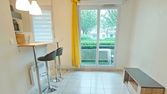 Il comprend un séjour lumineux avec une cuisine équipée, une salle de bain, une chambre confortable et un balcon avec des espaces verts.