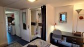 Appartement refait à neuf en 2021 avec cuisine équipée, cabine de douche, WC séparé et chambre lit double et dressing. L'accès à l'appartement se fait par une entrée individuelle. Charges incluant l'eau et les taxes d'ordure ménagères.