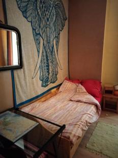 lit simple,fenêtre,douche et toilettes communs,rangement facile