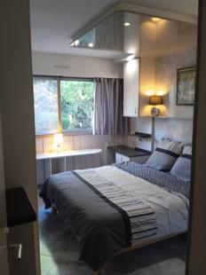 Chambre de 12 m2, placards, penderie, bureau secrétaire, lit 160, grande fenêtre donnant sur la nature, TV, box, DVD, parquet.