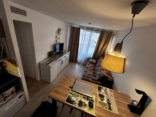 Un petit 2 pièces: salon avec cuisine ouverte, une petite chambre, SdB, WC, grande terrasse avec une très belle vue montagne. A proximité de tout: à 100 m à pieds transports, commerces, marché, mer. ...
