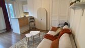 Studio composé d'une pièce de vie avec un placard aménagé, un canapé convertible, 2 tables gigognes, un vais…