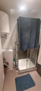 Mezzanine avec en haut un lit, armoire. En bas se trouve une table, la cuisine, machine à lavée. Puis dans une pièce appart la ...