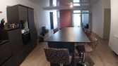 Cuisine séparée claire avec sa baie d'atelier donnant sur la pièce de vie et sa terrasse plein ouest, grande baie vitrée avec volet roulant.