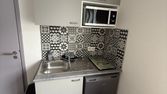 RDC: cuisine ouverte aménagée et équipée (four, hotte, plaque induction, frigo avec partie congélation), WC avec lave linge.