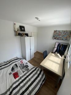 Chambre d'environ 12m2, avec banquette-lit deux places clic-clac, grand bureau, placard penderie, grande étagère métallique, ...