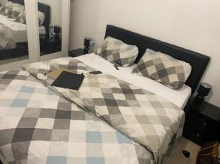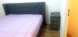 Une chambre avec un grand lit neuf 180×200, meuble et rangement. Grand tv ala salle de séjour. Un balcon. Cuisine.