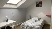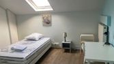 Chambre meublée avec literie complète, table, chaise, commode, étagère, corbeille, panier à linge. Porte des…