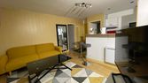 - Salon (ou chambre) : canapé-lit 3 places, table basse, bibliothèque et plancher chêne, bureau, chaise, placards