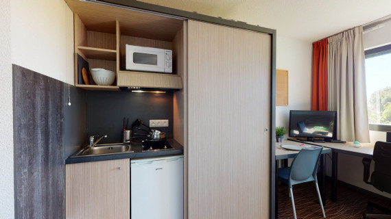 T1 de 20m² meublé et équipéLa résidence est à la fois sécurisée et surveillée, offrant des appartements meublés qui disposent de tout le confort nécessaire : lits, bureaux, chaises.