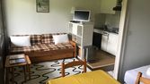 Intérieur comprenant un séjour avec cuisine, canapé-lit confortable, un fauteuil, TV, frigo / congélateur, four, micro-ondes, lave-vaisselle, grille-pain, app. raclette. Séche-serviettes électrique dans la salle de bains.