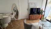 Le séjour fait 24 m² avec une cuisine équipée (lave-vaisselle), une table à manger (jusqu'à 6 personnes), TV, canapé, fauteuil et meuble TV.