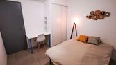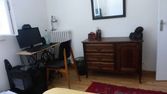 Grande chambre de 15m² sans vis-à-vis disponible. Exposée sud, équipée d'un lit double 140x200cm matelas et sommier de très bonne qualité, couette et oreillers + une parure de lit - une table de chevet avec sa lampe - un bureau accompagné de sa chaise et de sa lampe - un dressing + penderie.