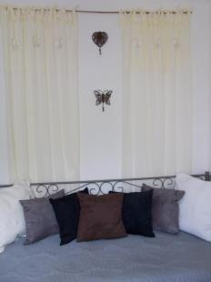 Chambre côté cours. Une grande terrasse en face mais les propriétaires n'y vont jamais. Soleil de 7h à 9h à peu près. Elle fait ...