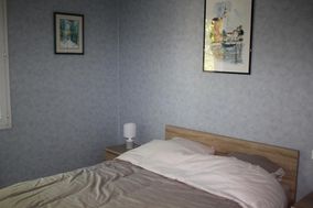 -d'une chambre avec un lit 2 places, un grand placard , 2 tables de chevet un ventilateur colonne oscillant avec télécommande