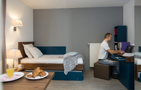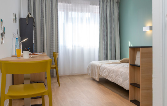 Chambres meublées et équipées situées dans une résidence étudiante accueillante. Composée d'une pièce avec lit, salle de douche et rangements, la chambre est équipée d'un réfrigérateur privatif. La cuisine ainsi que les WC sont collectifs. La résidence propose une salle de fitness, une salle commune, laverie, parking, espaces verts aménagés (table de ping-pong, baby-foot).