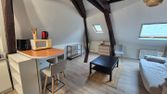 A louer, charmant studio meublé au 4e étage, proche gare et toutes commodités. Pièce principale : clic-clac…