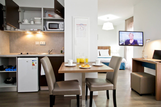- Les Studios sont composés d'une kitchenette (plaques vitrocéramiques, micro-ondes, réfrigérateur et vaisselle), une salle de bain privative, un coin nuit et un coin bureau.