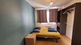 Chambre entièrement repeinte, meublée d’un grand lit, espace rangement et bureau. 12 m2 optimisés.