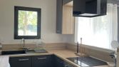 Hall d'entrée, cuisine équipée, four, réfrigérateur, micro-onde, ouverte sur un séjour avec terrasse.