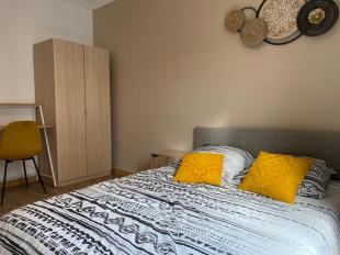 Chambre entièrement meublée avec lit double, rangements et bureau.