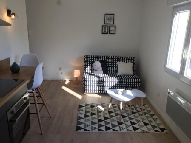 Centre-ville d'Orléans, dans une petite copropriété au calme, studio rénové de 18m² meublé et équipé comprenant : Lit de 90 avec couette, télévision, table, chaises, kitchenette équipée (plaques ...