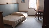 Chambre avec lit double, une armoire, deux penderies et placards derrière rideaux. Parquet massif ancien rénové en 2018. Fenêtre avec moustiquaire sur jardin.