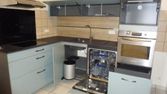 *Au fond de la pièce à droite, la cuisine sur 2 pans de murs carrelés et peint avec évier inox 2 bacs, rangements au dessous, hotte, plan de travail, étagère au dessus plan de travail