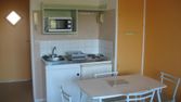 Une cuisine équipé est séparée plaque de cuisson et un frigo.