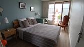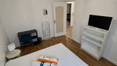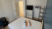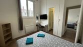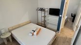 Dans un appartement rénové et équipé, la chambre est dotée d'un lit deux places, de rangements et d'un bureau
