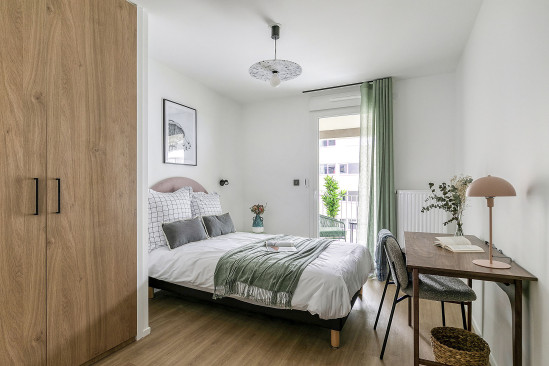 Appartement étudiant, T2 meublé de 31m² à 36m², résidence étudiante ReimsRésidence étudiante à Reims, proposant des logements étudiants de type studio et T2 meublés et équipés. Les logements disposent tous d'une kitchenette, d'une salle d'eau privative avec douche et WC, d'un coin bureau et d'un lit.
