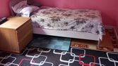 chambre meublée : un lit double avec literie et couette; un bureau, une armoire ou placard, une chaise et des étagères