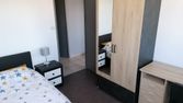 Chambre meublée avec lit double, bureau, chaise et rangements.