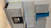 À cela s'ajoute, une salle de bain avec douche, sèche-serviette et meuble sous-vasque, une chambre lumineuse et un toilette séparé avec lave-mains et miroir de courtoisie.