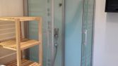 Salle de bain avec douche , meuble lavabo, meubles colonne, meuble mural, lave linge, sanitaire
