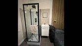 Chambre avec douche et lavabo dans une petite colocation, cuisine et WC partagée