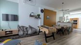 frigo, four multifonctions, plaques de cuisson, table + chaises, bouilloire électrique, cafetière Bosch Tassimo, télévision écran plat, aspirateur mural, lecteur DVD, plan de travail, ventilateur, vaisselle.