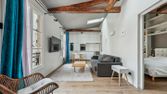 Il se compose de : une entrée avec rangements, un salon ouvert sur une grande terrasse de 15m2 sans vis-à-vis avec une vue sur Jardin, une chambre avec un coin bureau et plusieurs rangements, une salle de douche, une cuisine américaine aménagée équipée, un toilette séparé.