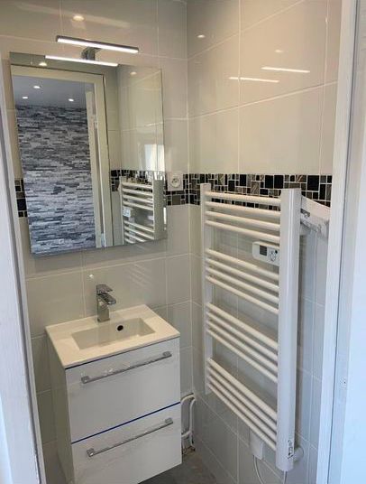 studio de 21 m² très lumineux et calme en parfait état, meublé, entrée avec rangements, cuisine américaine équipée avec bar et deux tabourets hauts(vaisselle, cafetière, micro-ondes, lave-linge) ...