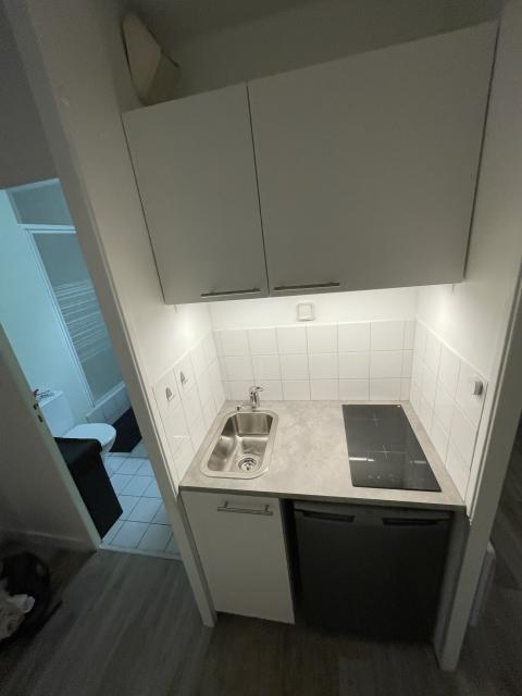 Studio loué meublé : kitchenette équipée (2 plaques vitrocéramiques, réfrigérateur, four micro-onde, équipement vaisselle inclus), lit 1 place avec tiroirs rangement, bureau, étagère, table et ...