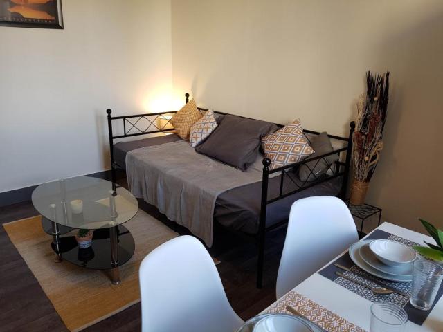studio en plein centre de lyon 9 norme BBC neuf avec cuisine équipée, meuble de rangement canapé table et chaises
