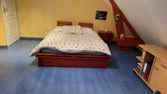 Une chambre de 12m2 équipée d'un lit de 140x190 avec couette et draps inclus , un coin bureau avec siège inclus , un grand placard pour un dressing et un chevet et une lampe . Une commode est équipée également avec une belle vue sur la nature un endroit paisible calme .