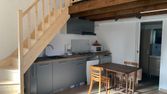 - Pièce à vivre avec coin cuisine entièrement équipé : Cafetière électrique, grille pain, vaisselle complète, ustensiles de cuisine, micro-ondes, frigo et plaque à induction 4 foyers.