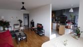 - Pièce de vie lumineuse avec cuisine intégrée récente, coin repas, coin salon avec canapé-lit et porte fenêtre donnant sur terrasse