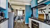 La cuisine ouverte est équipée d'un four, d'un micro-ondes, de plaques de cuisson, d'un évier, d'un réfrigérateur avec compartiment congélateur, lave-vaisselle ainsi que de nombreux rangements et ustensiles de cuisine.