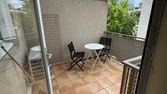 La pièce de vie est meublée avec un canapé, un fauteuil, une table basse, une table à manger pouvant accueillir 2 personnes. Elle donne également sur un balcon meublé d'une table et de deux chaises pour profiter du bon air.