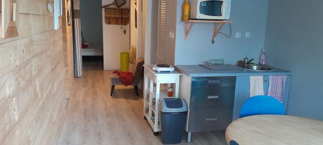 ce studio de 27 m² a une salle de bains avec baignoire et douchette, un WC séparé, un coin cuisine équipé, plaque de cuisson induction, frigo, four hotte aspirante et de nombreux placards de cuisine. ...