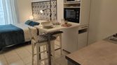 L'appartement comprend : une pièce à vivre avec penderie, bureau, commode, coin nuit (lit en 140, couette et oreillers, et linge de lit ) ouvrant sur un jardinet privé, un coin cuisine équipée d'un bloc évier/ plaques vitrocéramiques. réfrigérateur, rangement avec vaisselle, lave-linge, four à micro-ondes, d'une table et de chaises.